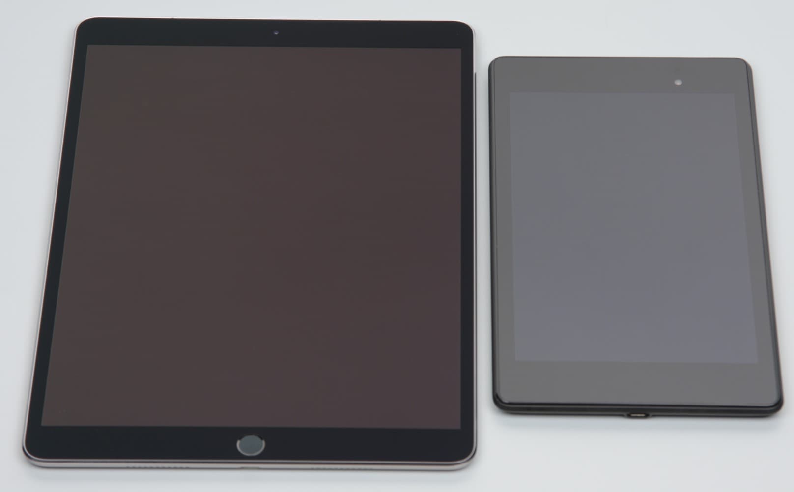 Лицевая поверхность экрана выполнена в виде стеклянной пластины с зеркально-гладкой поверхностью, устойчивой к появлению царапин. Судя по отражению объектов антибликовые свойства экрана гораздо лучше, чем у экрана Google Nexus 7 (2013) (далее просто Nexus 7). Для наглядности приведем фотографию, на которой в выключенных экранах отражается белая поверхность (справа — Nexus 7, слева — iPad Pro 10,5″, далее их можно различать по размеру):