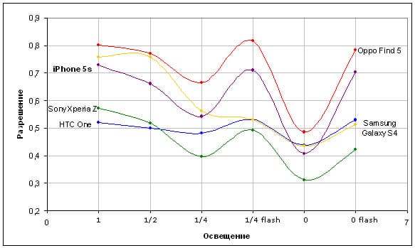По результатам съемки стенда камера показала себя очень достойно на фоне других смартфонов. Несмотря на меньшую матрицу размера 1/3,2″ и не самое большое разрешение, по графику видно, что камера iPhone 5s — одна из лучших. И это подтверждают не только цифры. Ей удается очень мягко работать на высоких значениях светочувствительности благодаря разумному шумодаву. Результат его работы напоминает работу функции подавления цветных шумов в RAW-редакторах, когда цветные шумы становятся серыми, и в таком виде практически незаметны. Шарпинг камеры едва заметен — и то если знать, где искать.