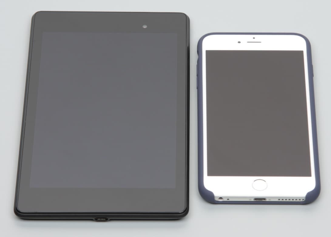 Лицевая поверхность экрана выполнена в виде стеклянной пластины с зеркально-гладкой поверхностью, устойчивой к появлению царапин. Судя по отражению объектов антибликовые свойства экрана лучше, чем у экрана Google Nexus 7 (2013) (далее просто Nexus 7). При этом некоторый оттенок отражения в поверхности экрана дает повод предположить, что в случае Apple iPhone 6s Plus применяется какое-то антибликовое покрытие. Для наглядности приведем фотографию, на которой в выключенных экранах отражается белая поверхность (слева — Nexus 7, справа — Apple iPhone 6s Plus, далее их можно различать по размеру):