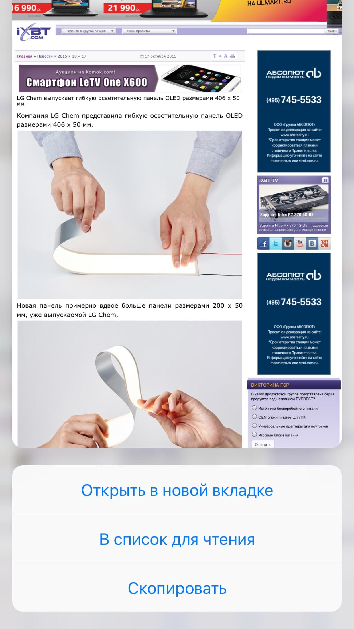 Теперь поговорим о технологии 3D Touch. Ей применение тоже нашлось — прежде всего, в письмах и сообщениях. В письмах это предпросмотр входящих — с возможностью тут же переместить это с другую папку. Особенно полезно в случае спама. Если вы видите интернет-ссылку (в письме или же на сайте), то можно опять-таки с помощью глубокого нажатия сделать предпросмотр и сохранить в список для чтения или открыть в новой вкладке.