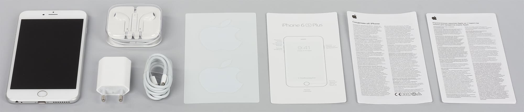 Что касается комплектации — здесь тоже никаких сюрпризов: наушники EarPods, вложенные в красивую коробочку, листовки, зарядное устройство (5 В 1 А), кабель Lightning, наклейки и ключик для извлечения колыбельки SIM-карты.