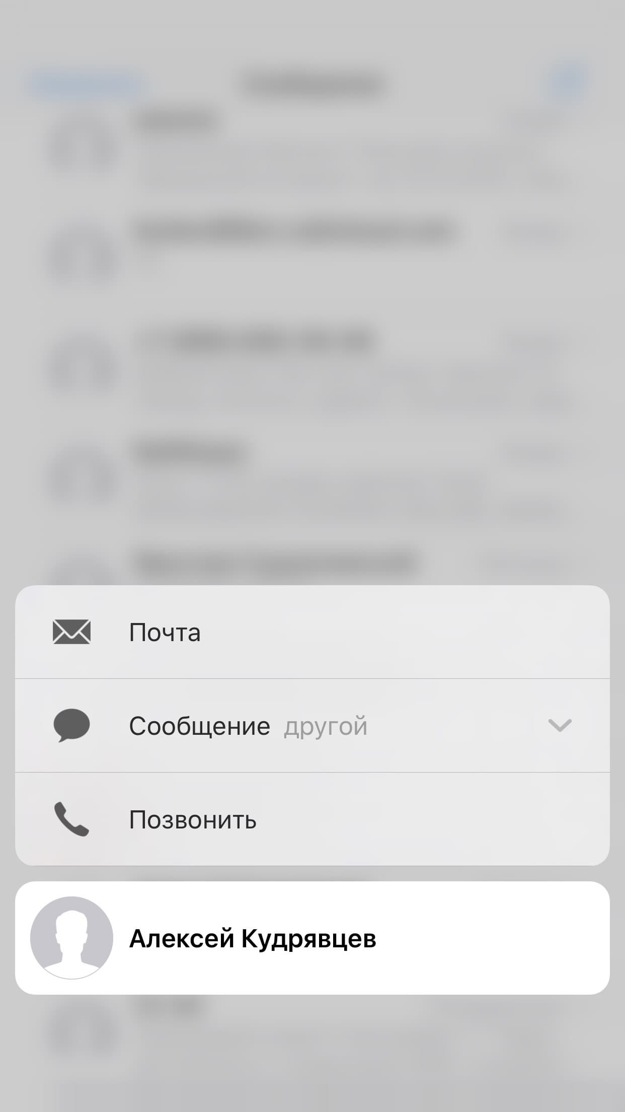 Зато это можно сказать про сообщения. Если вы открыли список сообщений (SMS и iMessage), то теперь для того, чтобы выбрать альтернативный способ связи с автором сообщения, достаточно с усилием нажать на круглую аватарку адресата. Появится меню, в котором можно выбрать звонок или письмо. Раньше для того, чтобы позвонить написавшему вам сообщение, надо было открыть это сообщение, нажать «Подробно» и только после этого вы видели значок телефонного вызова.