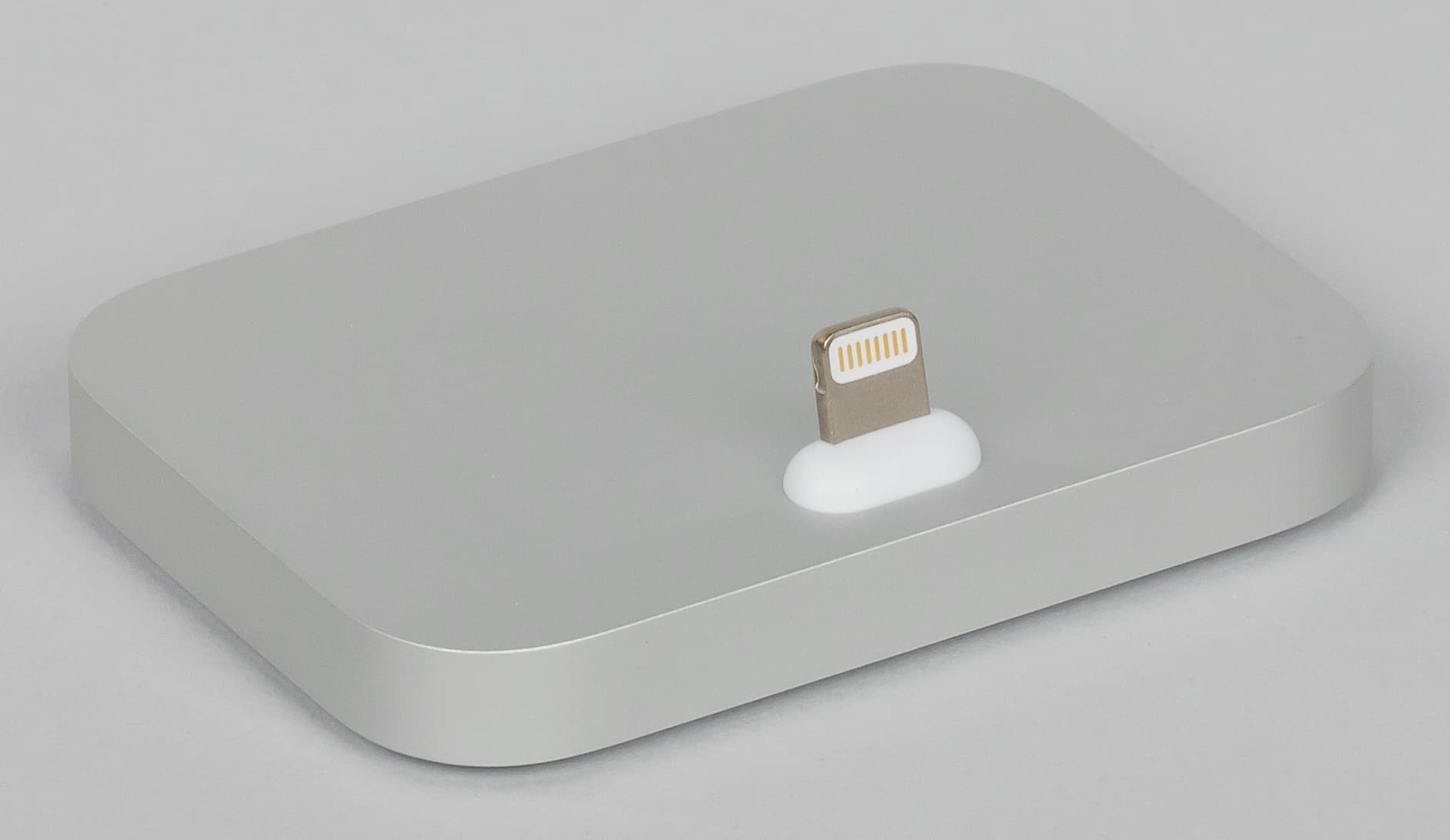 Док-станция представляет собой небольшой алюминиевый брусок с выступающим из него штекером Lightning. Под штекером есть небольшая силиконовая вставка, благодаря которой на док-станцию можно установить смартфон даже в чехле. Без чехла между смартфоном и поверхностью док-станции виден небольшой зазор — это вызывает опасения, что однажды штекер или же разъем смартфона могут повредиться, так как вся масса смартфона держится, фактически, на этом маленьком штекере, но хочется верить, что в Apple все тщательно проверили.
