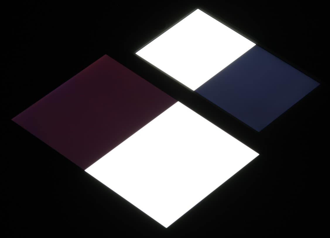 Яркость под углом у экранов уменьшилась (как минимум в 4 раза, исходя из разницы в выдержке), но в случае Apple iPhone 6s Plus падение яркости меньше. Черное поле при отклонении по диагонали высветляется в средней степени и приобретает фиолетовый оттенок. Фотографии ниже это демонстрируют (яркость белых участков в перпендикулярном плоскости экранов направлении примерно одинаковая!):