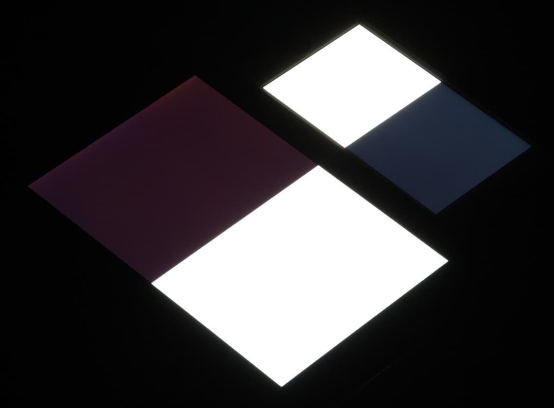 Яркость под углом у экранов уменьшилась (как минимум в 4 раза, исходя из разницы в выдержке), но в случае Apple iPhone 8 падение яркости меньше. Черное поле при отклонении по диагонали высветляется в средней степени и приобретает фиолетовый оттенок. Фотографии ниже это демонстрируют (яркость белых участков в перпендикулярном плоскости экранов направлении примерно одинаковая!):