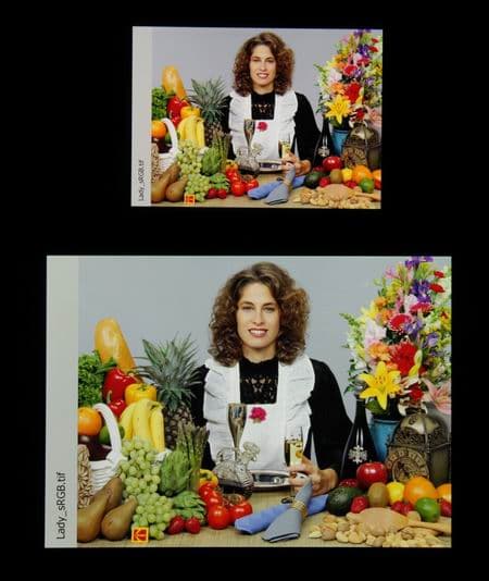 Это относится к тем изображениям, в которых прописан профиль sRGB или не прописано вообще никакого профиля. Однако родным для современных топовых устройств Apple является цветовое пространство Display P3 с немного более насыщенными зеленым и красным цветами. Пространство Display P3 основано на SMPTE DCI-P3, но имеет точку белого D65 и гамма-кривую с показателем примерно 2,2. Кроме того, производитель заявляет, что начиная с iOS 9.3 на системном уровне поддерживается управление цветом, это облегчает приложениям под iOS задачу правильно выводить на экран изображения с прописанным цветовым профилем. Действительно, дополнив тестовые изображения (файлы JPG и PNG) профилем Display P3, мы получили цветовой охват шире sRGB (вывод в Safari):