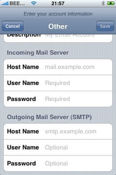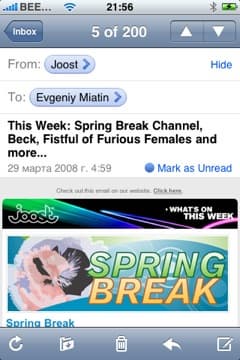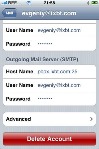 Во вкладке вы выбираете IMAP, POP или Exchange, заполняете необходимые поля, и готово. В теории. На практике, например, при установке того же Mail.ru, нужно будет сделать кое-что еще. Дело в том, что почтовый клиент, не спрашивая вас, устанавливает защищенное соединение SSL. Это хорошо, когда сервер поддерживает работу по SSL, а когда нет — тогда придется пойти на небольшую хитрость. Отключить SSL можно только тогда, когда эккаунт создан. Поэтому заполняем необходимые поля, ждем, пока iPhone попытается установить соединение. Если сервер не поддерживает SSL, то сделать это у него не получится, о чем он нам и признается — в диалоговом окне нужно отказаться от попыток продолжать установить соединение, но настройки эккаунта нужно все-равно сохранить. Теперь идем в Home Screen -> Settings -> Mail, выбирает эккаунт, нажимаем Advanced, и там уже отключаем SSL во входящих и исходящих настройках. Все, теперь все заработает.
