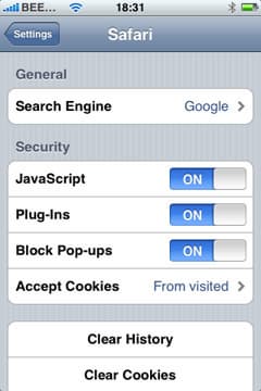 Что же, осталось заглянуть в настройки браузера. Здесь мы видим выбор поисковой системы (Google или Yahoo), возможности активации и деактивации JavaScript и плагинов, функцию включения блокировки pop-up окон, настройки Cookies (никогда, только от уже посещенных сайтов и всегда), кнопки для очистки истории, cookies и кэша, а также в меню Developer возможность активировать Debug Console, которая, в случае ее активации, автоматически будет появляться для решения ошибок, в случае возникновения таковых.