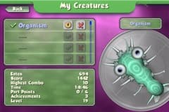 Но особое удовольствие игре придает, конечно же, Creature Creator, где вы можете усовершенствовать свое существо самыми неожиданными образами. Стоит вам пройти пару уровней, как вы наберете балл для этого самого усовершенствование. Смело заходите в Creature Creator и добавляйте вашему подопечному наиболее практичную часть тела (или просто перекрашивайте его, если хотите). Каждая часть тела, соответственно, дает определенные свойства. Вы можете добавлять глаза, сенсоры, щупальцы, колючки, щиты… словом, через несколько уровней вы сможете сделать действительно оригинальное и неповторимое существо. Самое интересное, что все эти надстройки нужны не потехи ради, а для непосредственного применения в океаническом бою. Ваше существо сможет лучше видеть (например, сквозь пузыри — и смотреть, есть ли там головастики), лучше чуствовать пищу (например, когда что-то съедобное рядом, но за пределами экрана, вы увидите характерную стрелочку), привлекать ее на короткое время, быстрее плавать и поворачивать, лучше обороняться и нападать. Словом, лучше-лучше-лучше и быстрее. Смотрите сами: