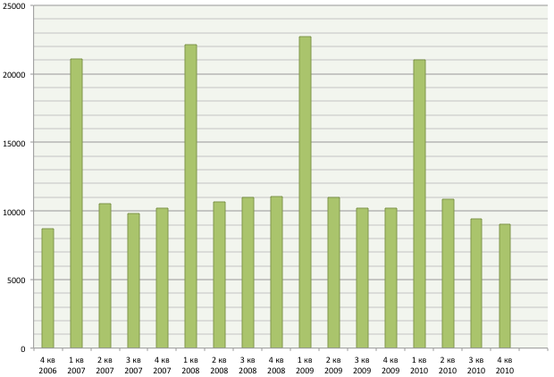 Продажи iPod в последние кварталы (тыс. шт.)