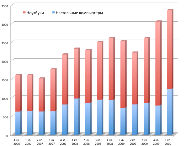 Продажи компьютеров Mac в прошедшем квартале вновь оказались рекордными для компании: всего было реализовано 3,89 млн. систем — на 400 тыс. больше, чем в предыдущем квартале и на 27% больше, чем год назад. Годовой рост продаж компьютеров Mac более чем вдвое выше среднего роста индустрии ПК (11% — по данным IDC). Основными факторами успешных продаж являются популярность новых моделей iMac, представленных в июле, и ноутбуков MacBook и MacBook Pro. Продажи последних двух вместе с MacBook Air составили 2,6 млн. единиц, традиционно превысив реализацию настольных компьютеров Mac (1,2 млн.). Для сравнения, в аналогичном периоде прошлого года продажи ноутбуков и настольных компьютеров составили соответственно 2,26 млн. и 787 тыс. устройств. За весь 2010 финансовый год было продано 13,6 млн. компьютеров Mac.