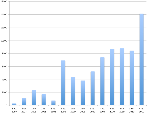 18 октября Apple провела традиционную телефонную конференцию, на которой были объявлены результаты четвертого финансового квартала 2010 года, продолжавшегося с июля по сентябрь. Этот квартал стал рекордным для компании во многих отношениях: ее доход впервые превысил 20 млрд. долларов, прибыль — 4 млрд. долларов, а Mac, iPhone и iPad отметились рекордным уровнем продаж.
