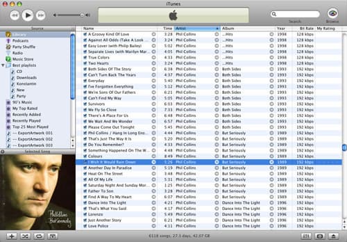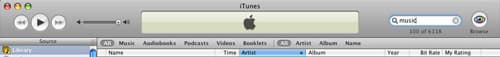 При поиске композиций появляется небольшая панель (как в Finder у Mac OS X Tiger), которая позволяет выбрать критерии поиска: тип (все / музыка / аудиокниги / подкасты / видео / буклеты) и поле (все / исполнитель / альбом / название). Панель максимально компактная и удобная — наверняка она вам понравится, но даже если нет, то уж точно не помешает.