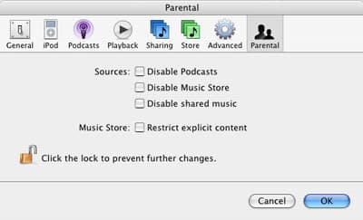 И, наконец, стала доступной функция «Parental Controls», которая может защищать детей от прослушивания нецензурных композиций и подкастов. Может быть запрещен доступ к подкастам, он-лайн магазину Music Store (либо целиком, либо только к его «взрослому» контенту), а также к открытым папкам других пользователей. Каждый из элементов, относящимся к этим пунктам, будет спрятан до ввода пароля администратора.