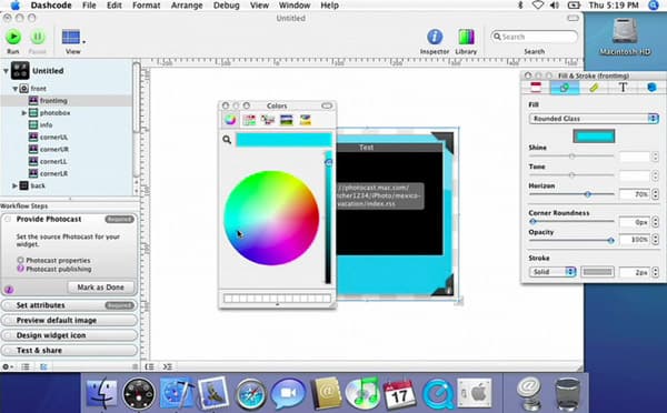 Dashcode. Специальная программа для разработчиков позволяет создавать виджеты даже тем, кто никогда, по словам компании, не написал ни одной строки программного кода. Это возможно благодаря наличию большого количества шаблонных виджетов, а также широкой поддержки drag'n'drop: например, если вы перетащите в виджет RSS-ссылку, то он станет отображать ее содержание, если перенесете ссылку подкаста, то виджет получит возможность его воспроизведения, и так далее.