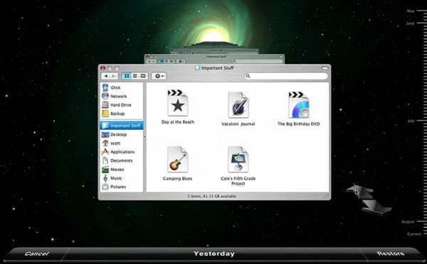 Самая интересная же функция Time Machine — возможность как бы вернуться назад во времени и захватить с собой из прошлого нужные файлы или папки. Звучит весьма фантастично, не правда ли? Давайте разберемся, как это выглядит на практике. Например, вы, просматривая свою директорию в Finder, обнаруживаете, что нужный вам файл отсутствует или был случайно изменен до неузнаваемости. Вы нажимаете на значок Time Machine в Dock-е и перед вами появляется эдакая временная линия — большой ряд выстроенных друг-за-другом окон, где каждое последующее окно является соответствующей версией нужной папки в прошлом. Вам остается пройтись по этому ряду «в прошлое», найти соответствующее окно в этой временной линии, когда файл был на месте, выделить его и нажать на кнопку «Восстановить». Причем, поддерживается работа не только с файлами, но и, скажем, с контактами в Address Book.