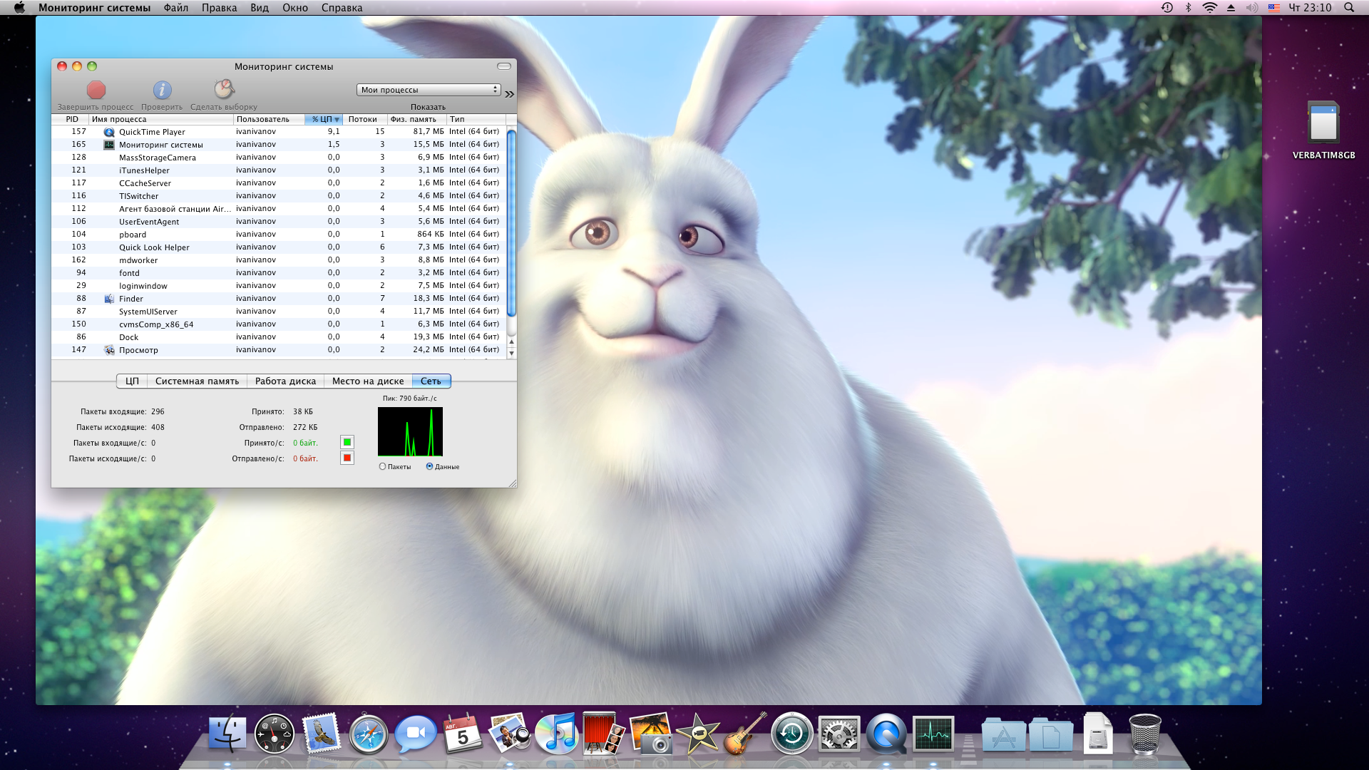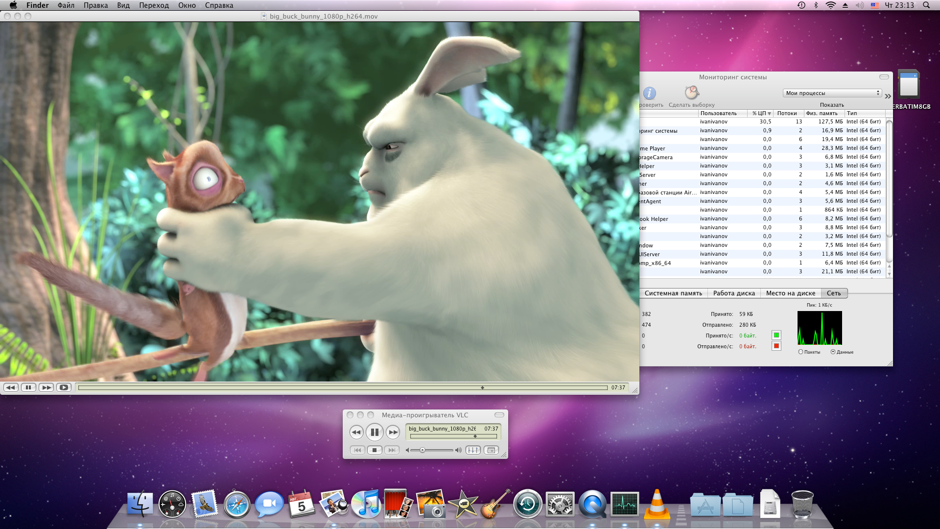 Как еще один вариант оценки скорости можно привести цифры по проигрыванию медиафайлов. Мы использовали известный ролик про зайца, записанный в формате MOV с кодеком H.264 и практически FullHD-разрешением. Отличием его от тех же Blu-ray-дисков является как минимум заметно меньший битрейт. Если этот ролик воспроизводить через комплектный QuickTime, то загрузка процессора по данным встроенной программы мониторинга составит около 10%. Но если использовать VLC Player, то загрузка возрастает до 30-40%, что говорит о том, что QuickTime задействует в процессе декодирования и видеокарту.
