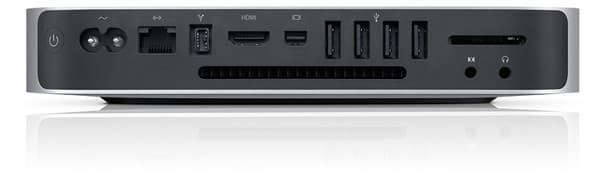 Компания Apple не стала ломать собственные традиции, поэтому на лицевой стороне ПК можно обнаружить только слот щелевого оптического привода и индикатор состояния ПК. Все разъемы скрыты от пользователя на задней панели устройства. Здесь располагаются: выключатель питания, вход кабеля питания, гигабитный сетевой порт, порт FireFire 800, HDMI, mini Display Port, четыре порта USB 2.0, слот для карт памяти (SD, SDHC, SDXC), звуковой вход и выход на наушники. Возможно стоило подумать о более доступном варианте для подключения карт памяти или USB, но в данном случае стиль важнее.