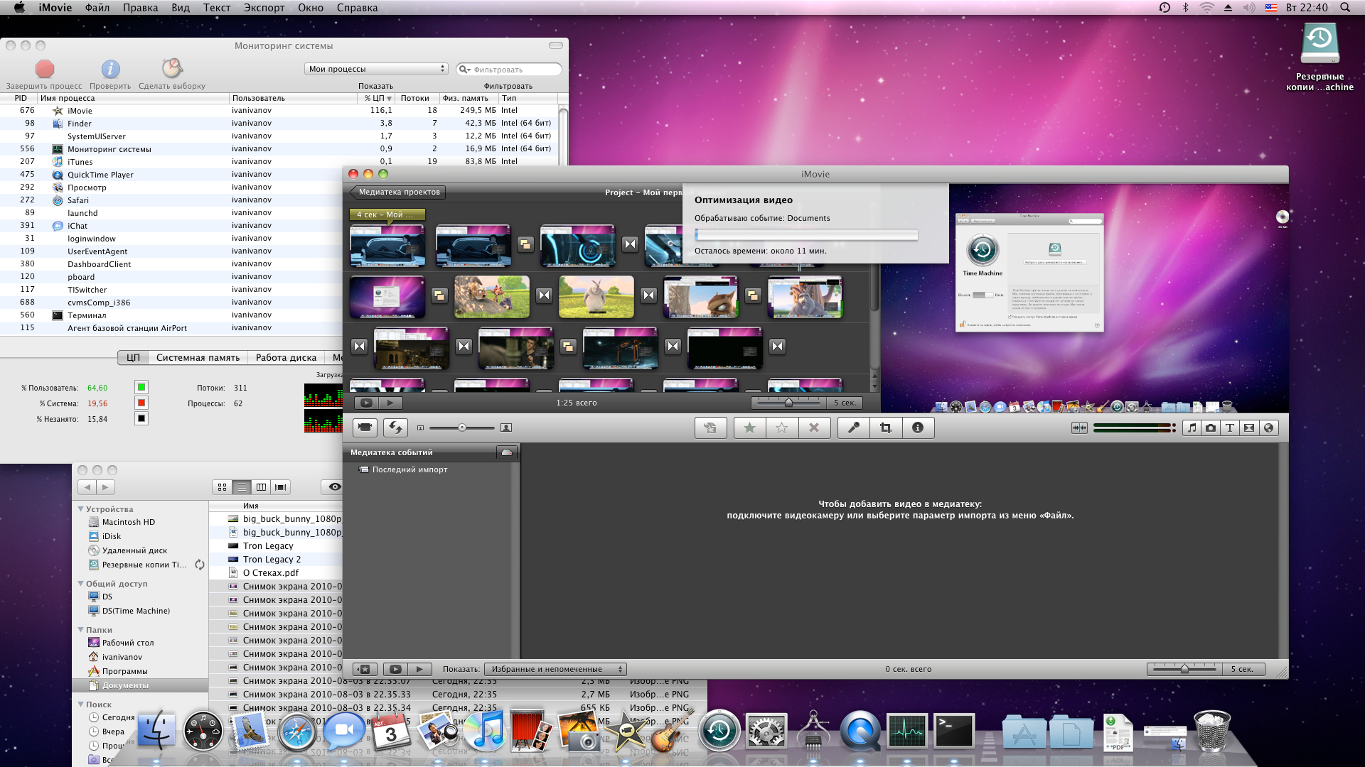 Не менее важна и мультимедийная составляющая, причем кроме многочисленных плееров для фотографий, музыки и видео (включая диски DVD) есть оболочка Front Row, знакомая по Apple TV и несколько программ для создания контента — iPhoto, iDVD и iMovie. Отдельно упомянем и GarageBand, которая может помочь вам научиться играть на музыкальных инструментах и записать собственную песню.