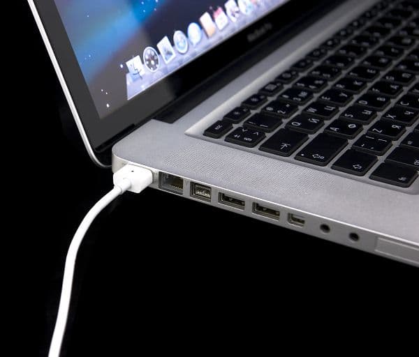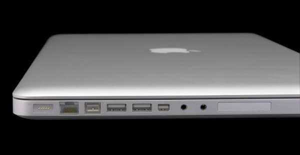 На левой стороне ноутбука мы видим порты и разъемы, слева направо располагаются MagSafe (питание), Ethernet, FireWire 800, 2 USB-порта, Mini DisplayPort, аудиовход, аудиовыход, ExpressCard/34, индикатор заряда аккумулятора (небольшая кнопка и 8 миниатюрных светодиодов).