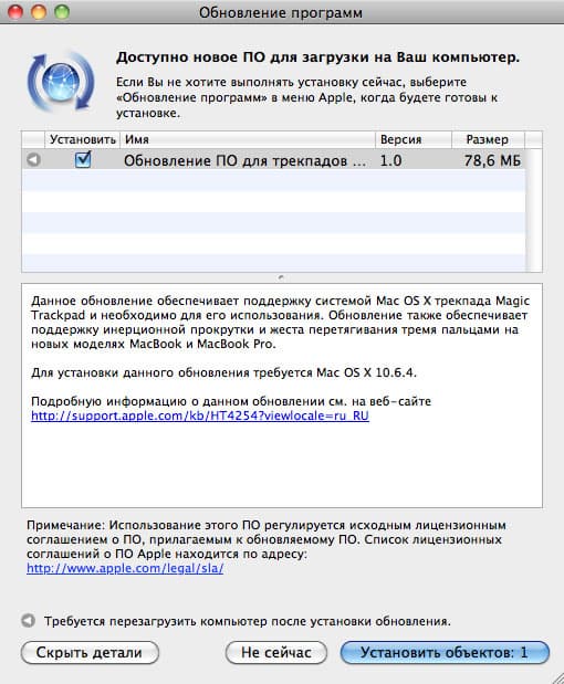 Апдейт «Обновление ПО для трекпадов» (размер — 78,6 МБ) содержит как драйвер, оптимизирующий работу Trackpad (чтобы не было вышеописанных срывов курсора и т. п.), так и программу, позволяющую лучше узнать и настроить устройство. Программа эта располагается в Системных настройках, где после установки апдейта мы увидим следующую картину.