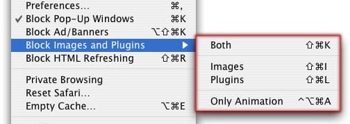 Эта функция приходится весьма кстати, особенно если учесть высокую нагрузку на процессор при просмотре сайтов с Flash- и Gif-анимацией. Активируется она через меню Safari —> Block Images and Plugins —> Only Animation.