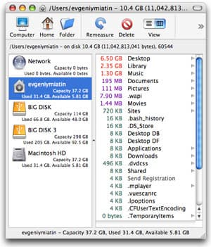 Поскольку мы заговорили об удалении ненужных файлов, то просто нельзя пройти мимо двух очень полезных программ для этих целей. Это WhatSize (432 КБ) и Disk Inventory (2 МБ). Начнем с первой: WhatSize представляет собой аналог Finder-а, в котором рядом с каждой папкой и файлом указан размер занимаемого пространства, причем все объекты отсортированы по размеру, так что найти наиболее крупные файлы и папки не представляет никакого труда.