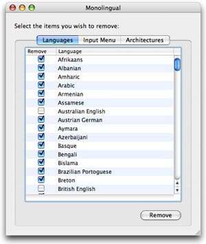 Для тех, кто хочет освободить таким образом несколько сотен мегабайт на своем диске, создана программа Monolingual. После ее открытия отметьте языки, от которых вы хотите избавить систему, и нажмите Remove. Monolingual также позволяет в ваших программах избавиться от ненужных файлов под различные архитектуры, но мы не рекомендуем использовать эту возможность — слишком велик риск их испортить.