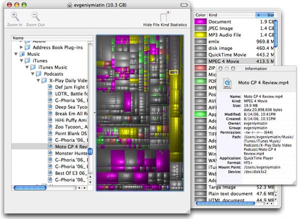 Более необычна программа Disk Inventory. Она отличается тем, что представляет информацию в графическом виде — то есть, перед вами появляется прямоугольник, внутри которого расположены многочисленные прямоугольники других цветов. Чем больше по размеру прямоугольник, тем больше места на жестком диске занимает файл или папка.