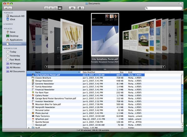 Вторым из объявленных нововведений стало обновление Finder, который теперь стал как две капли воды похожим на iTunes. Помимо трех привычных режимов просмотра файлов и папок — иконок, столбцов и таблицы — в новом Finder появился режим Cover Flow. Так можно просматривать документы, графические файлы (с превью) и даже иконки приложений. Из iTunes также перекочевало разделение боковой панели окон Finder на группы — помимо привычных дисков и папок, здесь теперь можно найти ссылки на все ресурсы домашней сети, имеющие общий доступ, а также несколько ссылок для быстрого поиска — например, всех документов, измененных вчера, или всех видеороликов, которые хранятся на жестком диске или в других компьютерах Mac или PC в локальной сети. Подписчики сервиса .Mac также получили инструмент Back to my Mac, который позволяет получить доступ к файлам и папкам, хранящимся на жестком диске подключенного к Интернет компьютера Mac, из любой точки мира.