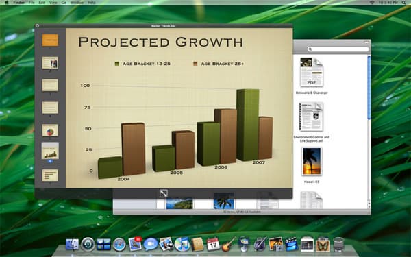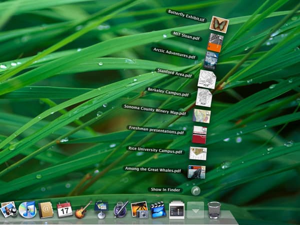 В качестве иллюстрации работы стеков компания выбрала папку, в которую загружаются файлы из Интернет. Всем пользователям наверняка известна проблема захламления рабочего стола файлами, загруженными с помощью web-браузера, после чего благополучно забытыми. По умолчанию, в Leopard загружаемые из Сети файлы будут сохраняться не на рабочий стол, а в папку Downloads, которая будет представлена в виде стека в доке. Кликнув мышью по стеку, пользователь может получить доступ ко всем объектам, хранящимся в соответствующей папке. Кроме того, сам док тоже получил свою порцию «украшательств» — как он теперь выглядит, можно увидеть на иллюстрации.