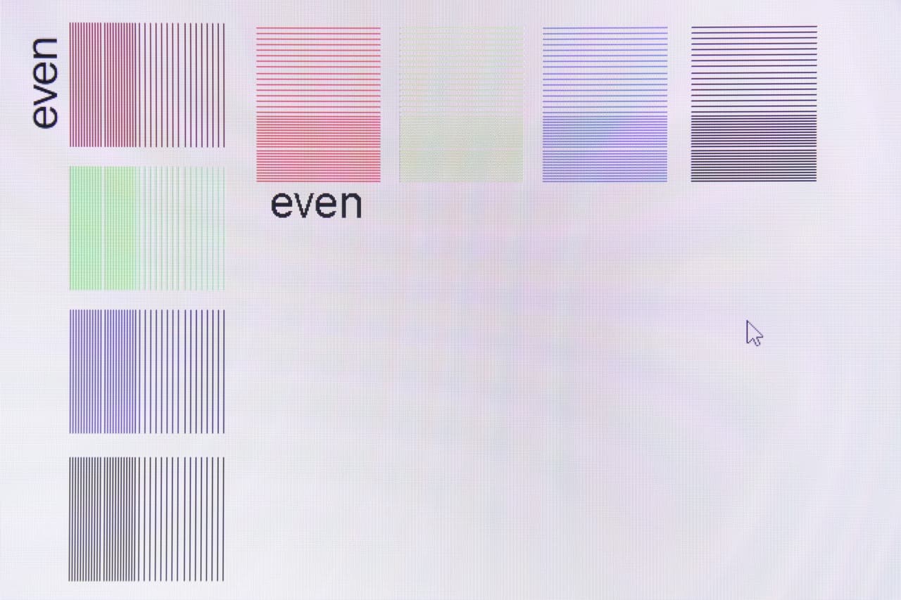 Пиксель у LG состоит из красного, зеленого, синего и белого субпикселя, у Samsung и Xiaomi — из красного, зеленого и синего субпикселя, а у Harper один пиксель — из красного, зеленого и синего субпикселя, а каждый второй пиксель — только из белого субпикселя. В итоге на том расстоянии от экрана, на котором от разрешения 4К есть польза, картинка на этом ТВ выглядит «рыхлой». Пример приведен на фотографии экрана ниже (полоски через пиксель и через два пикселя), ее лучше рассматривать в масштабе 1:1 (исходное тестовое изображение).