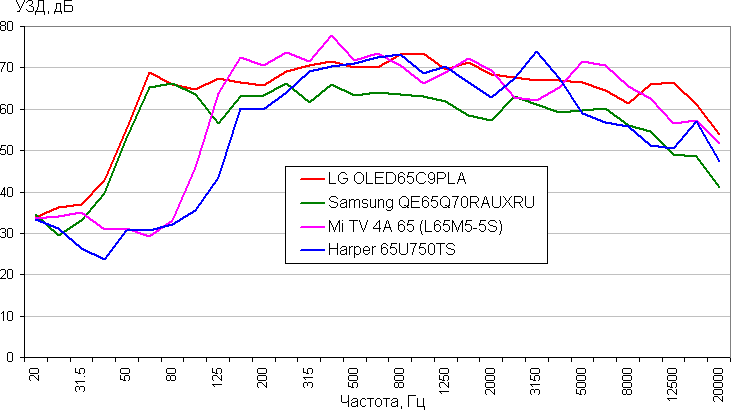 Видно, насколько больше низких частот у ТВ LG и Samsung. Также графики АЧХ этих ТВ более-менее ровные, без значительных провалов и пиков. Отметим, что при сравнимом качестве субъективно звук у ТВ Samsung нам понравился чуть больше. Звук у двух оставшихся ТВ не такой громкий, низких частот уже практически нет, зато есть выраженные призвуки из-за резонансов корпуса, при этом качество звука у Harper немного хуже, чем у Xiaomi.