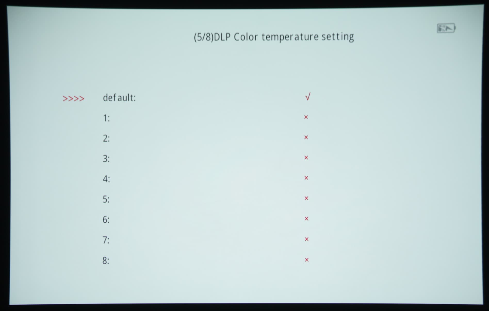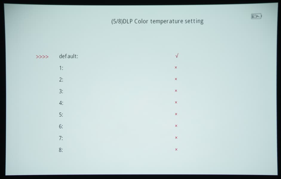 Близкий к черному диапазон можно не учитывать, так как в нем цветопередача не так важна, а погрешность измерения цветовых характеристик высокая. В режиме по умолчанию цветовой баланс средний, так как цветовая температура близка к стандартным 6500 К, но отклонение от спектра абсолютно черного тела (ΔE) высокое, на большей части шкалы серого выше 10 единиц (естественно, за счет избытка зеленого цвета). При этом хотя бы цветовая температура мало изменяется на всей имеющей значение части шкалы серого, что благоприятно сказывается на субъективном восприятии цветового баланса. Если при выводе заглавной странице несколько раз быстро нажать на кнопку с пиктограммой домика, то на экран выводится некое сервисное меню, в котором в частности можно выбрать один из восьми дополнительных предустановленных профилей.