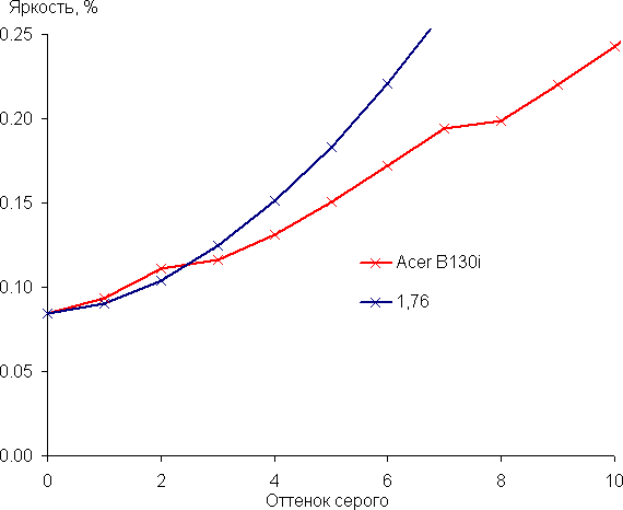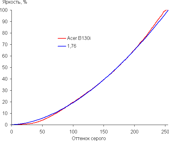Аппроксимация полученной по 256 точкам гамма-кривой дала значение показателя 1,76, что ниже стандартного значения 2,2, то есть картинка высветлена. При этом реальная гамма-кривая заметно отклоняется от аппроксимирующей функции: