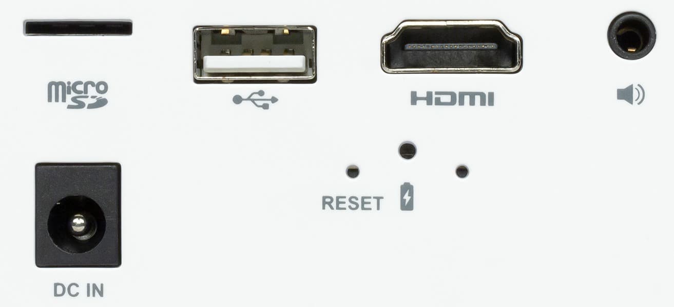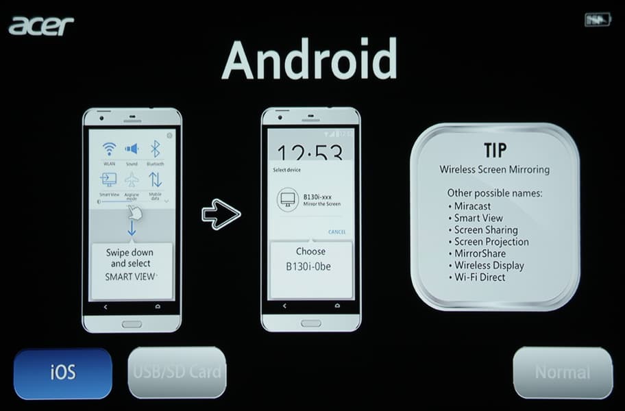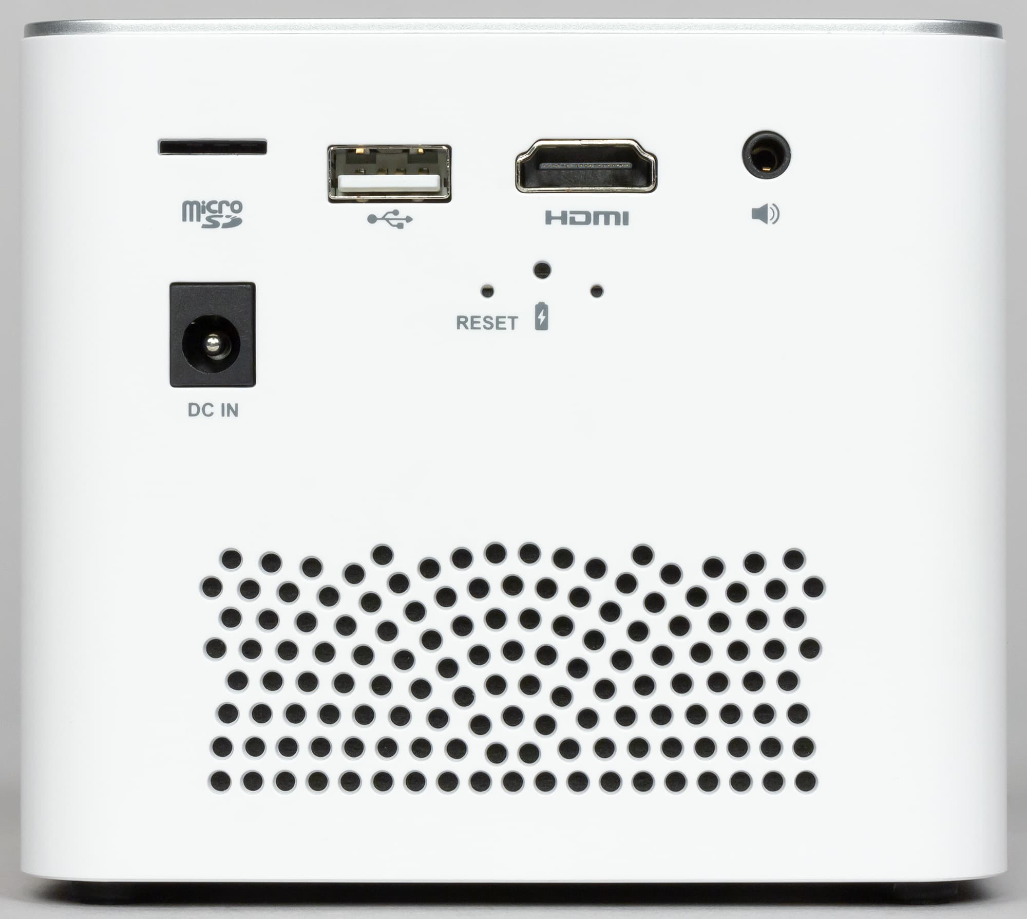 Все разъемы стандартные и расположены достаточно свободно. Подписи к разъемам хорошо различаются. Аудио/видеовход один — HDMI. При подключении источника по HDMI проектор безальтернативно переключается на этот вход. Выход на наушники или внешнюю аудиосистему — обычный миниджек 3,5 мм без оптического интерфейса. USB используется для подключения накопителей, включая внешние жесткие диски. Поддерживаются USB-разветвители, а устройства ввода — нет. С карточек microSD, как и с USB-носителей, проектор умеет воспроизводить файлы мультимедийных форматов. Проектор поддерживает беспроводной (по Wi-Fi) прием изображения и звука в режимах Miracast и AirPlay. На главной странице интерфейса выводятся подсказки, как подключить мобильное устройство к проектору. Кнопками на экране можно переключать режимы (Miracast/AirPlay) беспроводного подключения и соответствующие экраны с подсказками, также описан способ с использованием кнопки питания, но мы его в деле не пробовали.