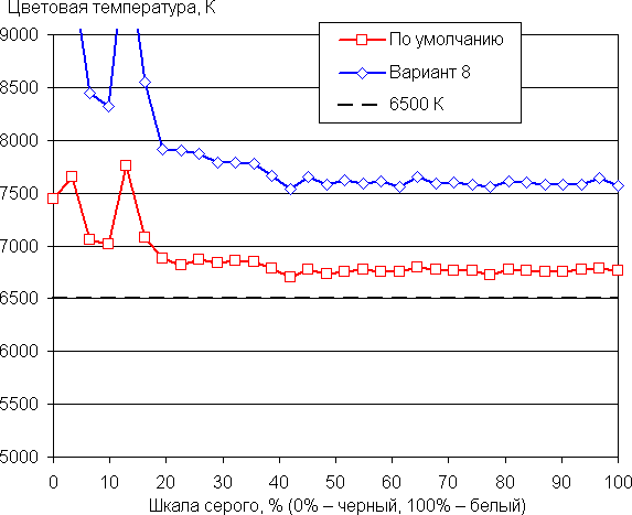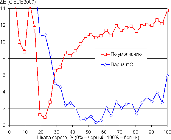 Вариант под номером 8 характеризуется минимальным ΔE на белом поле, но и чуть более высокой цветовой температурой (см. графики выше). Нам он понравился больше, чем вариант по умолчанию.