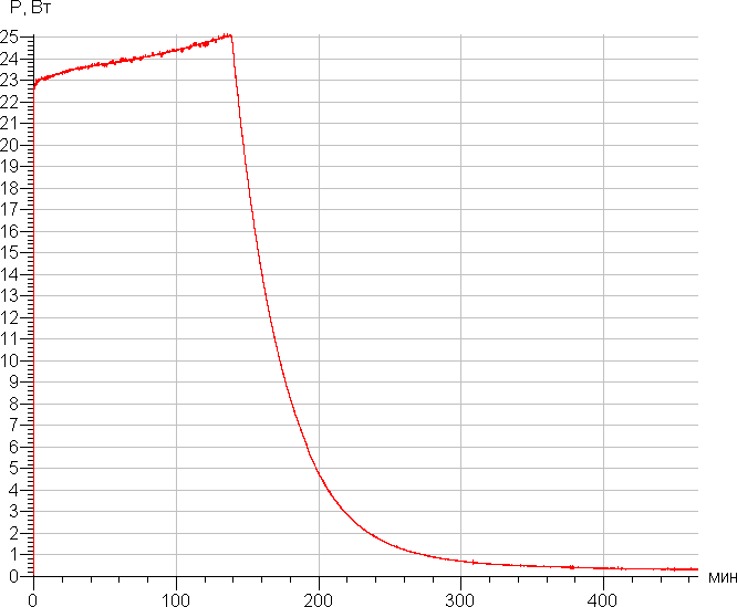 При работе от встроенного аккумулятора в режиме с высокой яркостью проектор смог показывать картинку в течение 3 часов, что в 1,5 раза больше заявляемой производителем автономности в 2 ч. В режиме с пониженной яркостью стоит рассчитывать на увеличение времени автономной работы где-то в 1,7 раза. На почти полную зарядку аккумулятора проектору требуется порядка 5 часов (хотя большая часть емкости наполняется гораздо раньше), если он находится в режиме ожидания. Зависимость потребления от времени при зарядке:
