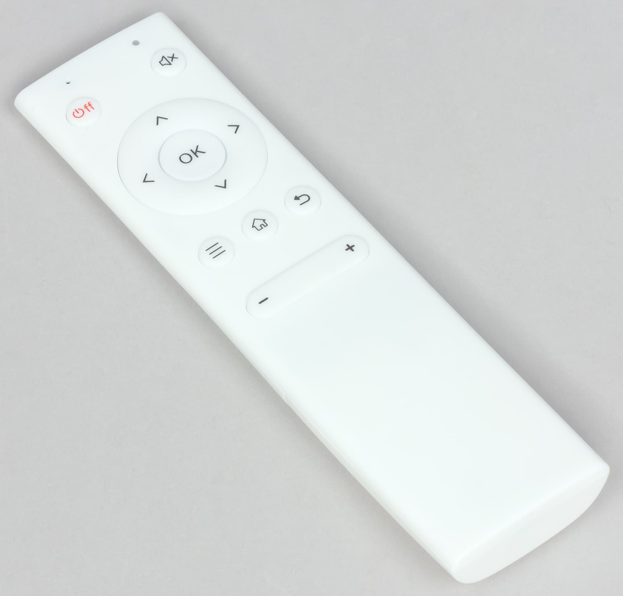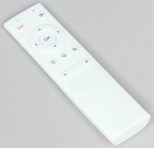 Пульт небольшой и легкий, в руке он лежит удобно. Его корпус изготовлен из белого пластика с матовой поверхностью. Источниками питания служат два элемента типа AAA. Кнопки изготовлены из резиноподобного материала. Обозначения кнопок достаточно контрастные. При передаче команд ярко светится красный индикатор в передней части пульта. Подсветки кнопок нет, но так как их немного, то нужная кнопка легко находится на ощупь. С пульта нельзя включить проектор — можно только выключить. Включается проектор только кнопкой на корпусе — ее нужно удерживать несколько секунд, не отпуская даже после того, как зашумит система охлаждения проектора. Выключается он с пульта и той же кнопкой на корпусе.