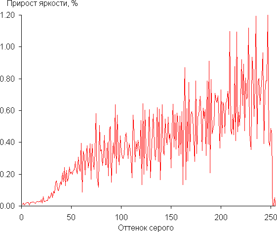Для оценки характера роста яркости на шкале серого мы измерили яркость 256 оттенков серого (от 0, 0, 0 до 255, 255, 255). График ниже показывает прирост (не абсолютное значение!) яркости между соседними полутонами: