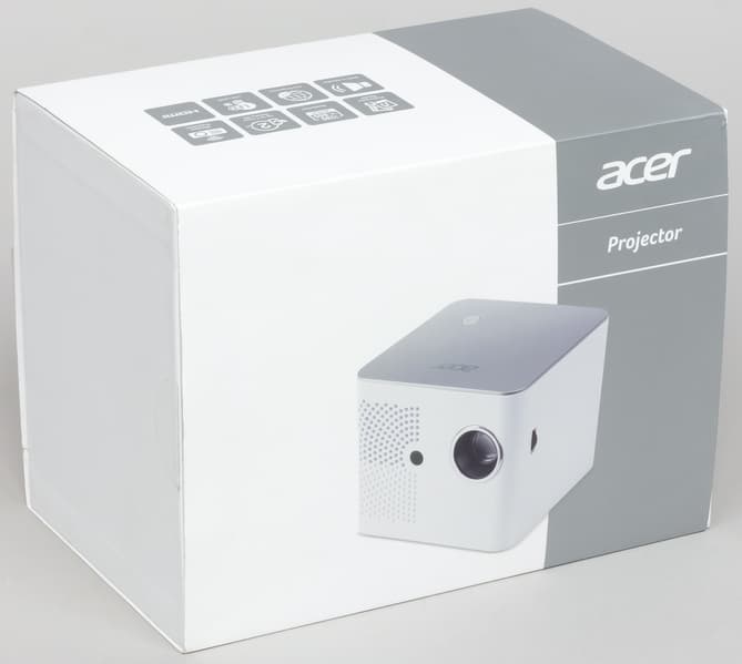 Половинки коробки удерживает вместе чехол из картона, на внешних поверхностях которого изображен сам проектор и в виде пиктограмм с подписями перечислены его основные особенности. Для защиты и распределения содержимого используются вкладыши из поролона, картонные вкладка и коробочки, пластиковые пакеты.
