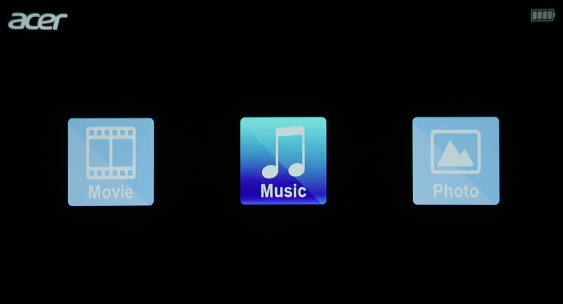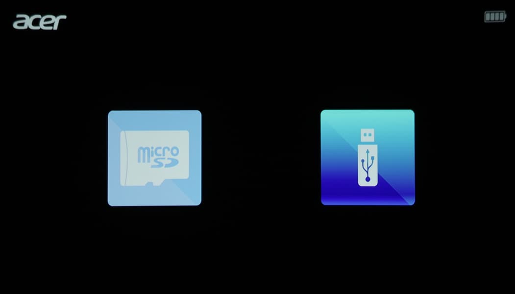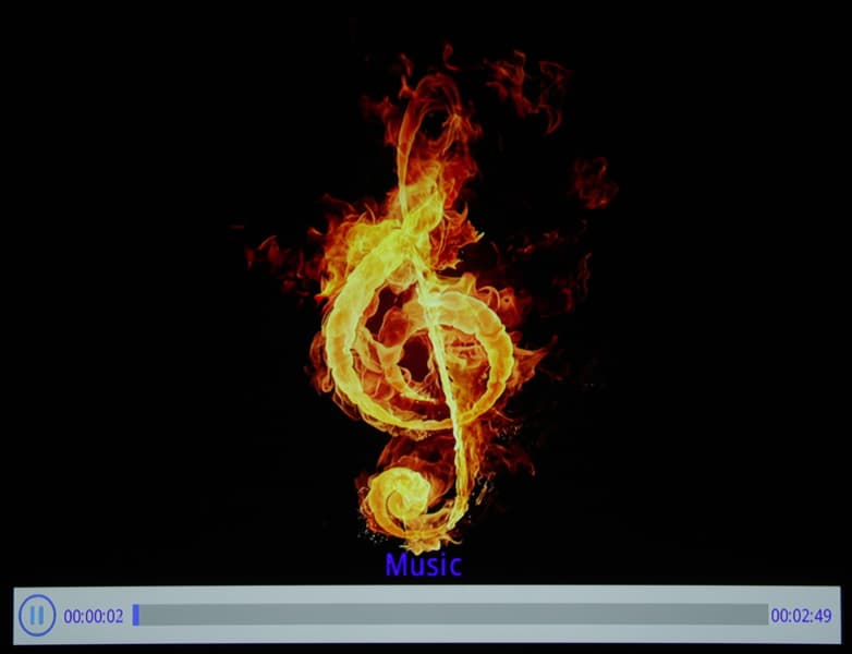 Плеер проектора воспроизводит видеофайлы в контейнерах MPG (кодеки MPEG-1/2), AVI (XviD), MP4 (H.264, MPEG-4), WMV (WMV-9 MP@ML менее 3000 Кбит/с), MKV (H.264), TS (MPEG-2). Самый беспроблемный вариант — это контейнер MP4 или MKV и кодек H.264. В этом случае битрейт может быть до 110 Мбит/с включительно. Поддерживается декодирование звуковых дорожек в форматах MPEG-1, MP3, AAC LC, PCM и WMA (не Pro). Переключаться между аудиодорожками нельзя, а субтитры не поддерживаются. Управление — приостановить/продолжить и переход на 30 секунд назад и вперед. Картинка видеофайлов формата 4:3 чуть вытянута по горизонтали, а формата 16:9 — по вертикали.