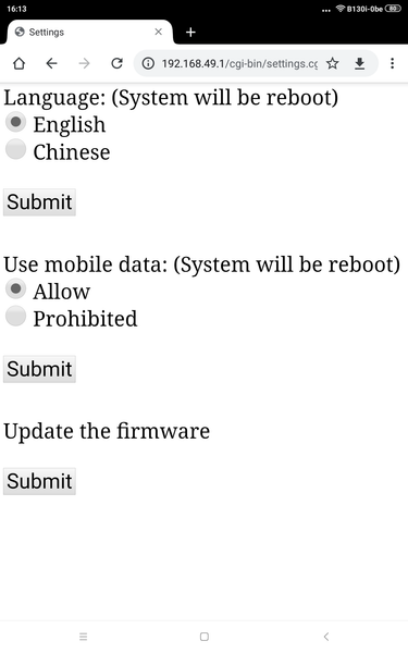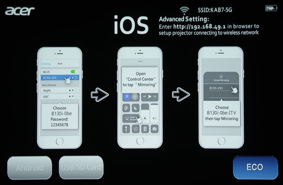 Поддерживается подключение к точке доступа проектора, а также работа в режиме инфраструктура. Для реализации второго варианта нужно сначала подключится к проектору в режиме точки доступа, зайти на веб-сервер проектора и на странице настроек указать параметры той сети, к которой должен подключиться проектор. На другой странице можно переключить язык интерфейса проектора и загрузить в него обновление прошивки. Режим инфраструктуры удобен тем, что мобильное устройство может оставаться подключенным к Сети по Wi-Fi. Вопреки паспортным данным поддерживается работа в диапазоне 5 ГГц.
