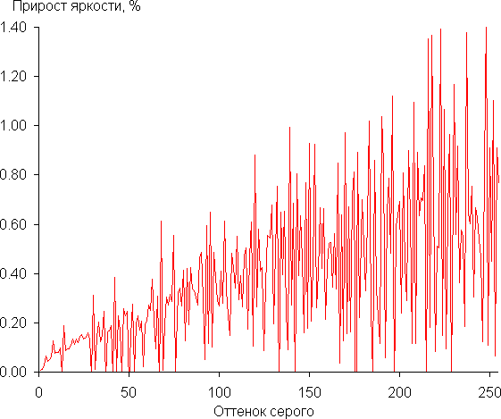 Только в случае варианта Video в тенях различаются все оттенки, в других случаях 1-2 оттенка, ближайшие к черному не отличаются от него по яркости и визуально. График ниже показывает прирост (не абсолютное значение!) яркости между соседними полутонами, полученный при последовательном выводе 256 оттенков серого (от 0, 0, 0 до 255, 255, 255) в случае Gamma = Video: