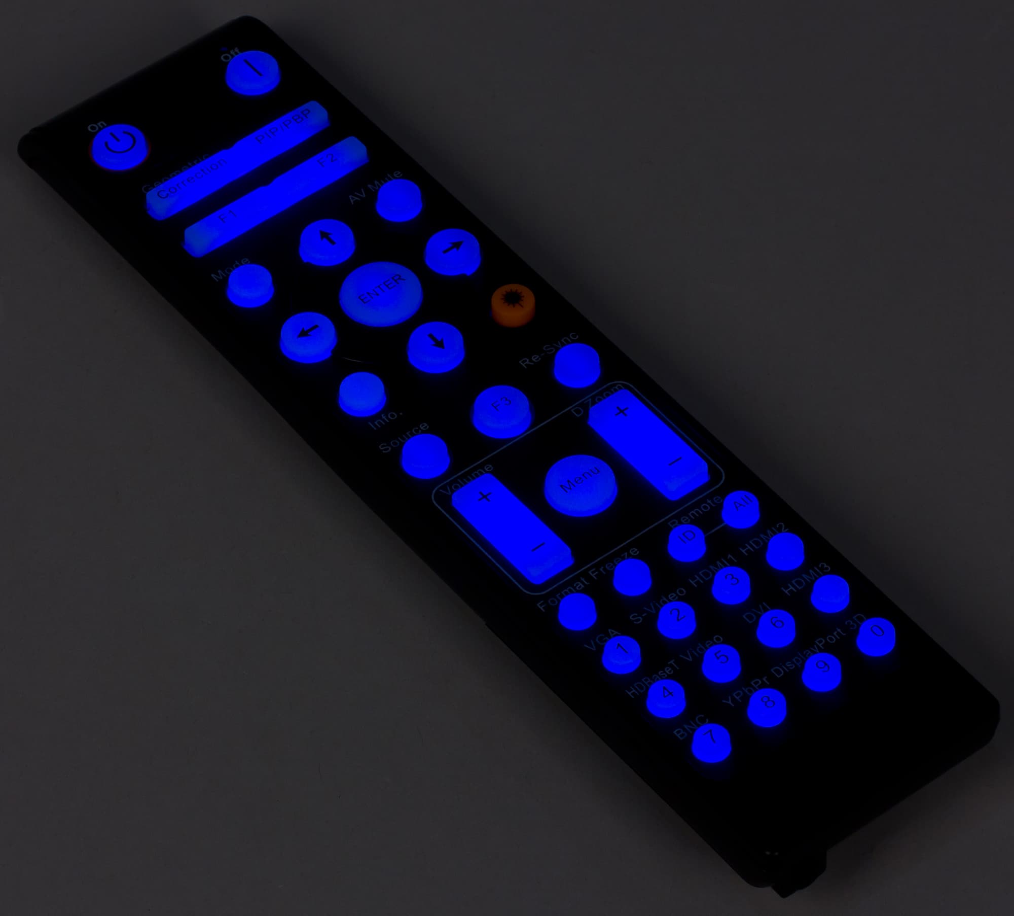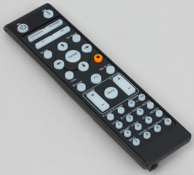 В меню можно отключить один из двух ИК-приемников или оба. Пульт можно переключить в режим согласования идентификатора, тогда им будет управляться только тот проектор, на котором установлен такой же идентификатор, что и на пульте. Есть красная лазерная указка, включающаяся оранжевой кнопкой. Пульт допускает проводное подключение к проектору — гнездо миниджек 3,5 мм в задней части пульта закрыто резиновой заглушкой. Коды кнопок пульта приведены в руководстве.