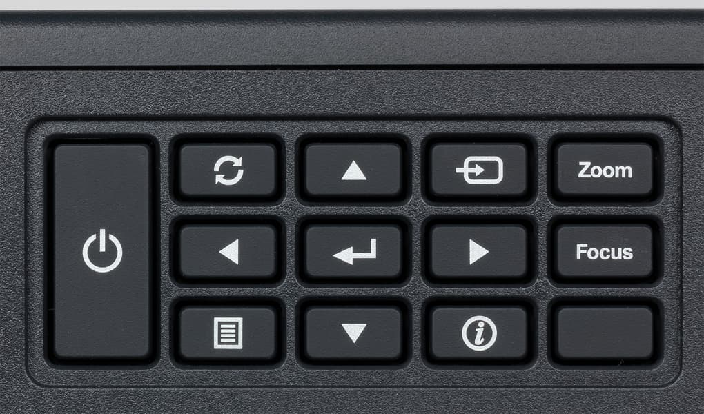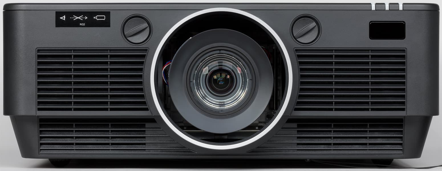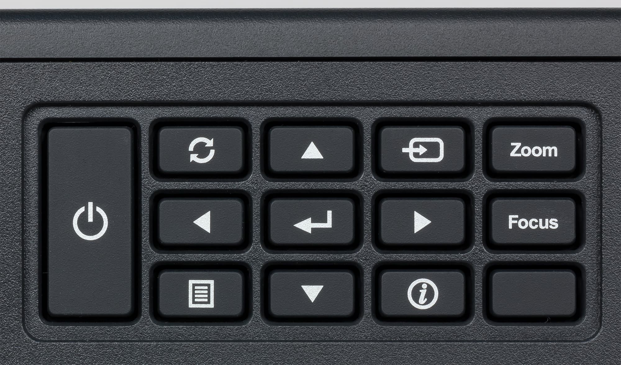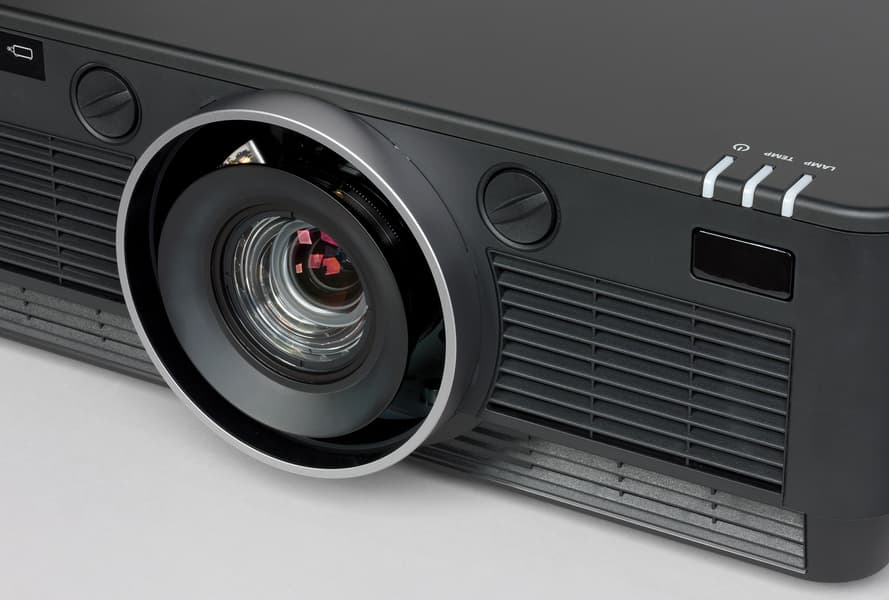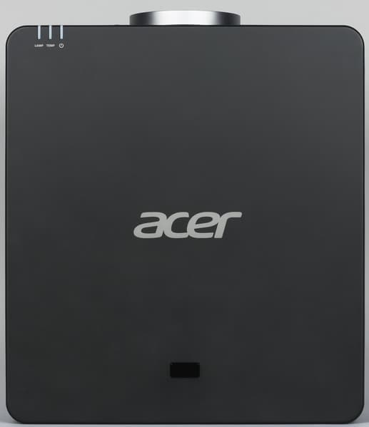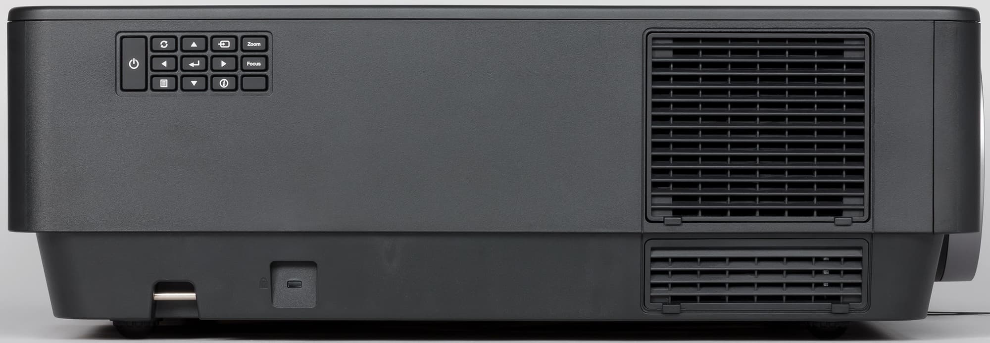 Дизайн строгий, он подошел бы домашнему кинотеатральному проектору высокого класса. Внешние панели корпуса проектора изготовлены из пластика с черным матовым покрытием. Ниша объектива — из алюминиевого сплава с матовым серебристым покрытием. Бленда объектива, как и его корпус также металлические. Компоновка симметричная — ось объектива совмещена с продольной осью корпуса проектора, — что приятно с эстетической точки зрения и несколько облегчает установку проектора. На правом боку ближе к задней части размещены кнопки управления, а ближе к передней — съемные вентиляционные решетки, за которыми, по всей видимости, можно разместить опциональные воздушные фильтры. На стыке днища и правого бока есть стальной штырь в нише, за который проектор можно пристегнуть к чему-то массивному, чтобы не украли. Рядом находится разъем для кенсингтонского замка.