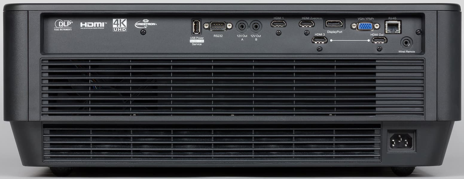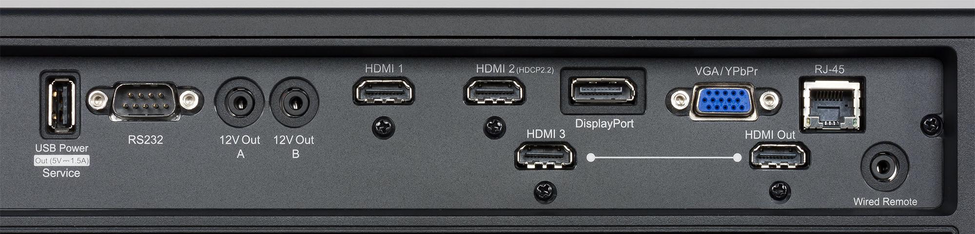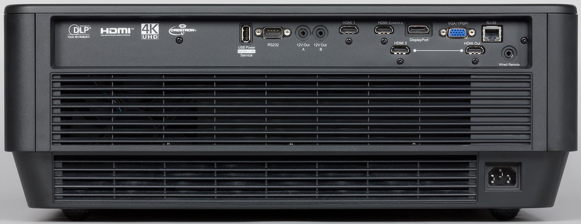 Проектор оснащен тремя HDMI-входами, входом DisplayPort, что для проекторов редкость, и единственным аналоговым видеовходом — VGA (с поддержкой компонентного сигнала). Входы HDMI неравнозначные, только HDMI 2 имеет версию 2.0 и поддерживает HDCP 2.2. С практической точки зрения это означает, что именно он поддерживает не просто видеосигнал с разрешением 4К, но и с максимально возможной цветовой четкостью при частоте 60 кадр/с. Переключение между источниками осуществляется с помощью кнопки Source на корпусе проектора или на пульте (при этом на экран выводится список входов, в котором выбирается нужный вход) или кнопками прямого выбора на пульте. Есть отключаемая функция автоматического поиска активного входа с ограниченным количеством циклов перебора входов. Цепь управления экрана с электромеханическим приводом можно подключить к одному из выходов с названием 12V Out.