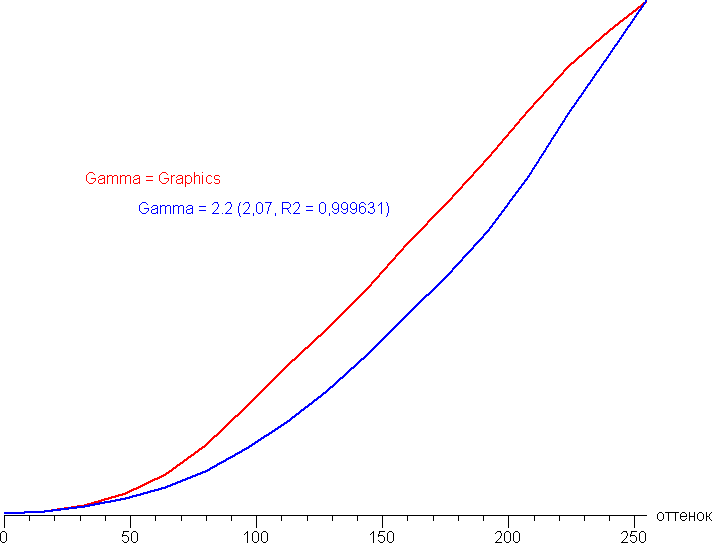 В случае вариантов с числами, а также Film и Video реальная гамма-кривая хорошо аппроксимируется степенной функцией, но показатель немного ниже указанного. Вариант Graphics имеет выраженный S-образный характер: