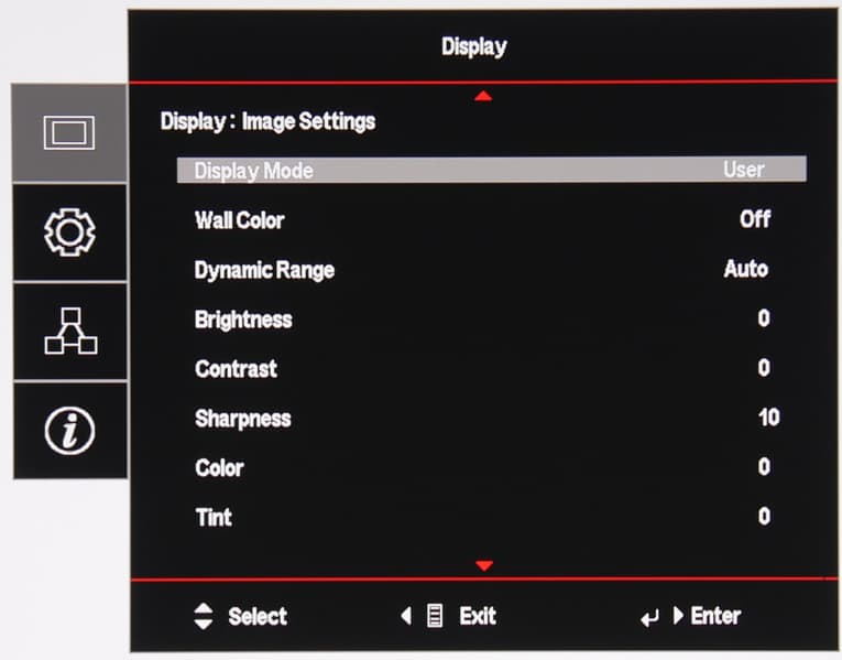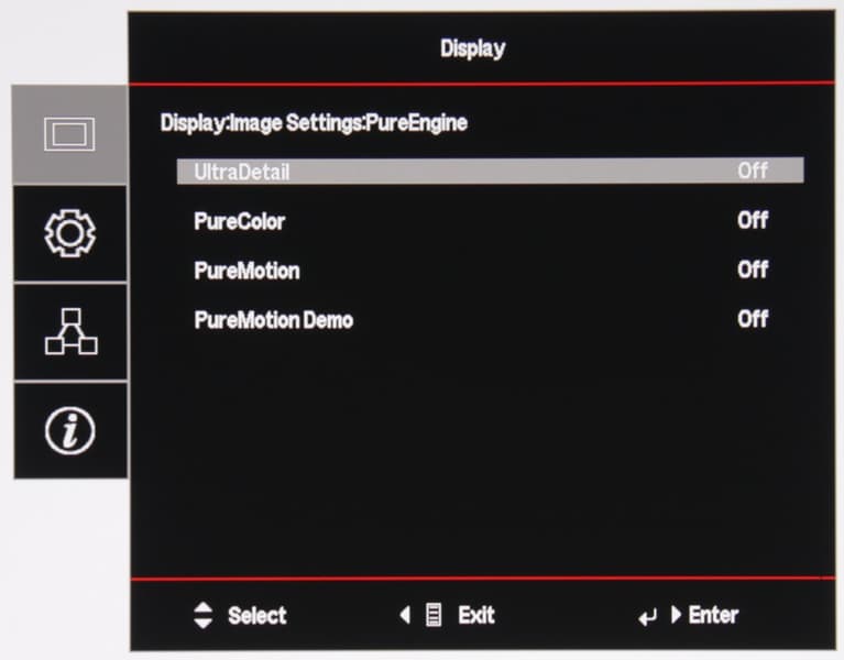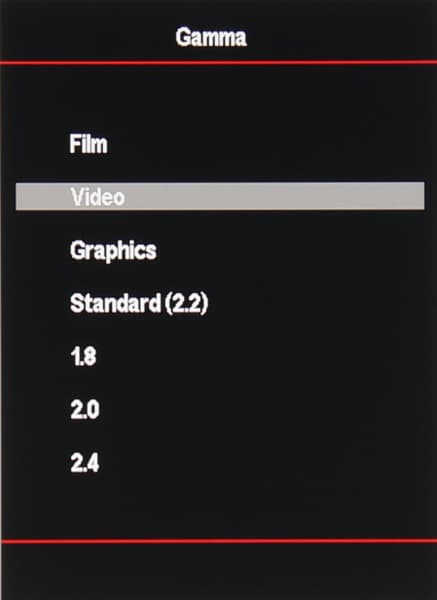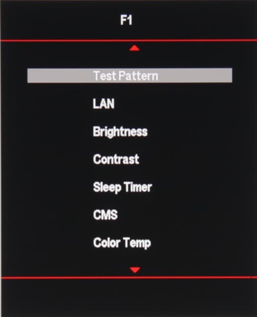 Меню строгое, оно имеет преимущественно черно-белое оформление. Шрифт меню мелковат, поэтому читаемость невысокая. Настроек много. Навигация удобная, но ее немного затрудняет то, что на пульте между кнопкой Menu и блоком курсорных кнопок расположена кнопка F3. Самая нижняя строчка меню содержит подсказку по функциям кнопок. При настройке некоторых параметров, влияющих на изображение, на экран выводится минимум информации — только название настройки, ползунок и текущее значение, — что облегчает оценку вносимых изменений картинки (белый прямоугольник ниже — это вся область вывода изображения).