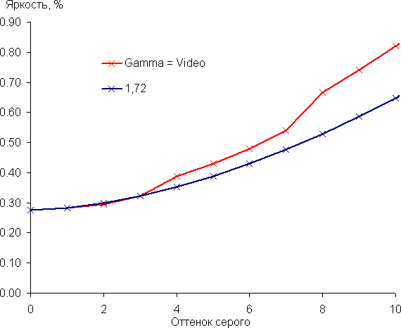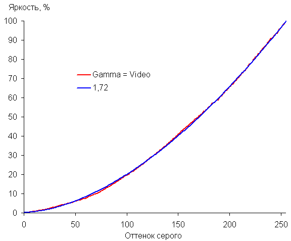 Реальная гамма-кривая аппроксимируется степенной функцией с показателем 1,72, что ниже стандартного значения 2,2: